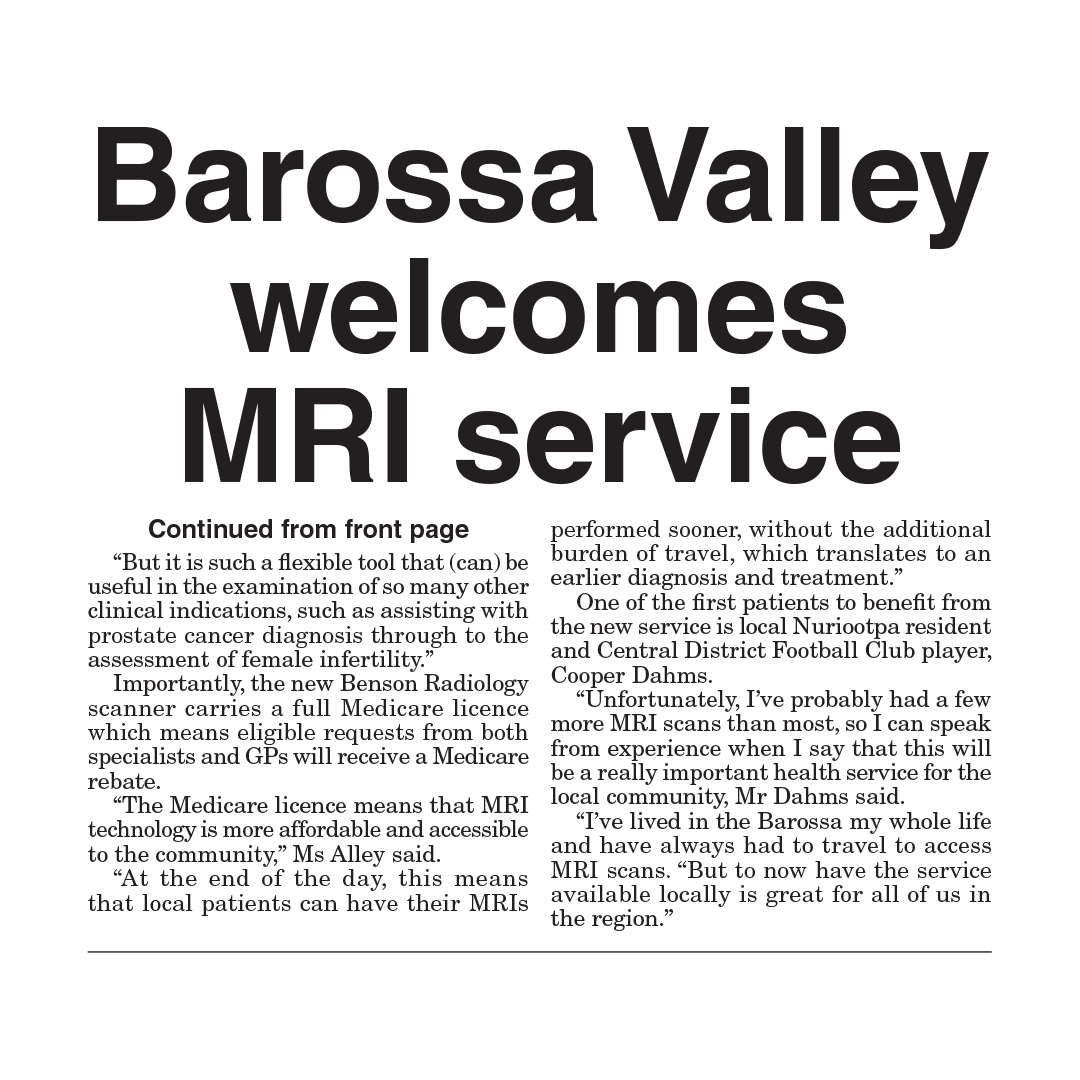 Our MRI service is up and running in the Barossa Valley…exciting times. Special thanks to The Leader for paying us a visit this week and also our first patient, Cooper Dahms from the Central District Football Club.